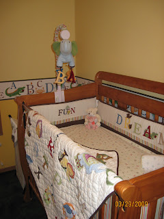 Back in February, on Valentine's weekend, Alex surprised me with many wonderful things. One of those surprises involved the baby nursery. Prior to that weekend the only thing in the nursery was a crib and white walls. We had many conversations about the nursery and ideas of what we wanted to do but wanted to wait until after the baby shower to really do anything. My baby shower was held that Saturday. Alex and I were spending the weekend at the West Baden Springs Hotel (another surprise). So after the shower, Alex and Dustin had taken all of the gifts to our house while the rest of us went ahead to French Lick as we were all having dinner together. After dinner we toured the West Baden Hotel and then they all headed out. I was extremely exhausted and so was my family so they headed out semi-early. I had made plans with my family to go to Home Depot on Sunday to pick out paint for the nursery. I wanted their opinions since they were in town and I now had the crib bedding to match to. Alex was going to paint soon so I could start getting things organized. We decided to come back to our house first and eat pizza together and then while the guys were watching IU basketball the women would head into Jasper to Home Depot. Little did I know that Alex still had surprises for me. Someone had asked me what all I got at the shower, so I went to the nursery where all of the gifts were taken on Saturday. The door was closed and as I opened the door there was Dustin standing there with a camera. I thought he was taking pictures of some of the gifts and I didn't want to interrupt him so I closed the door back but not all of the way. As I looked back through the cracked door I noticed the walls were yellow. I couldn't beleive it. I was completely surprised!! Friday night of that weekend, Alex had made arrangements with my dad to come to our house and paint the walls 2 shades of yellow. He had worked with my sister Tammy to determine the best colors that would go with the bedding that I had picked out. Then on Saturday, while I was at my baby shower, the guys came to our house and hung the wall border. Little did I know that my family had left 'early' Saturday evening to head to our house to put my nursery together. They had worked for a couple of hours that evening, unpackaging everything I had gotten at the baby shower earlier that day, putting things together and organizing my nursery. It brought tears to my eyes to know how wonderful my husband was in organizing a surprise such as this. He did such a wonderful job!!! I was also quite relieved to know that a big chunk of my nursery was complete. Over the past month and a half, we have purchased a few more items, hung things on the wall, and washed all of the clothes, sheets, towels, and blankets. The final touch was going to be placed this past weekend but unfortunately it did not go as planned. My sister Melanie had given me an Uppercase Living saying for Christmas for the nursery to be hung on the wall above the crib. Needless to say, we had difficulties with the saying not coming off of the paper to put on the wall and were unable to hang it. Such a bummer! I will have to come up with another alternative for that wall. I am thinking about putting the babies name there once it is known. I am now happy to share with all of you pictures of our nursery. We are pleased with how it all turned out. Now we just wait for the arrival of the baby. Enjoy!!!